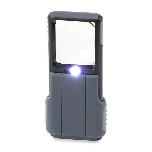 The three predetermined positions of the collapsible handle on the Carson LED Lighted Magnifold 2x Power Rectangular Magnifier For Reading, Inspection, Low Vision, Hobby and Crafts (MJ-50, MJ-50AMMU) make it easy to use. A rectangular shape provides a view of an area that conforms to the typical reading pattern. At 4.2 x 2.4 inches, it allows a reader to see a little bit ahead. The power for built-in illumination depends on three G10 button cell batteries that come with the magnifier. The price for the device that offers 2X magnification is within the average range for similar aids, and it carries a lifetime limited warranty for defects in workmanship or manufacturing. The plastic rim around the acrylic lens protects it from potential scratches.